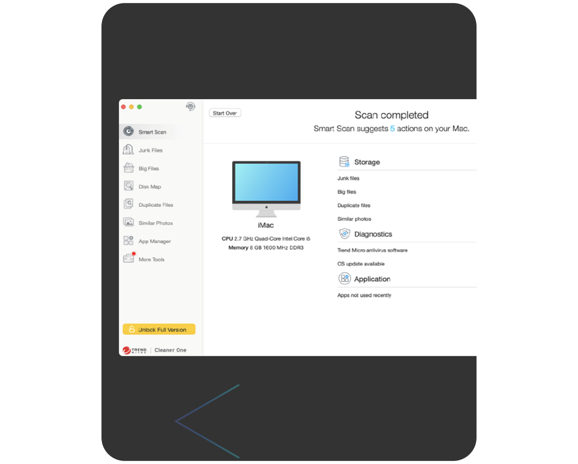 Smart Scan provides an overview of your storage usage, system health status, and unused applications to help you clean, protect, and optimise your Mac.